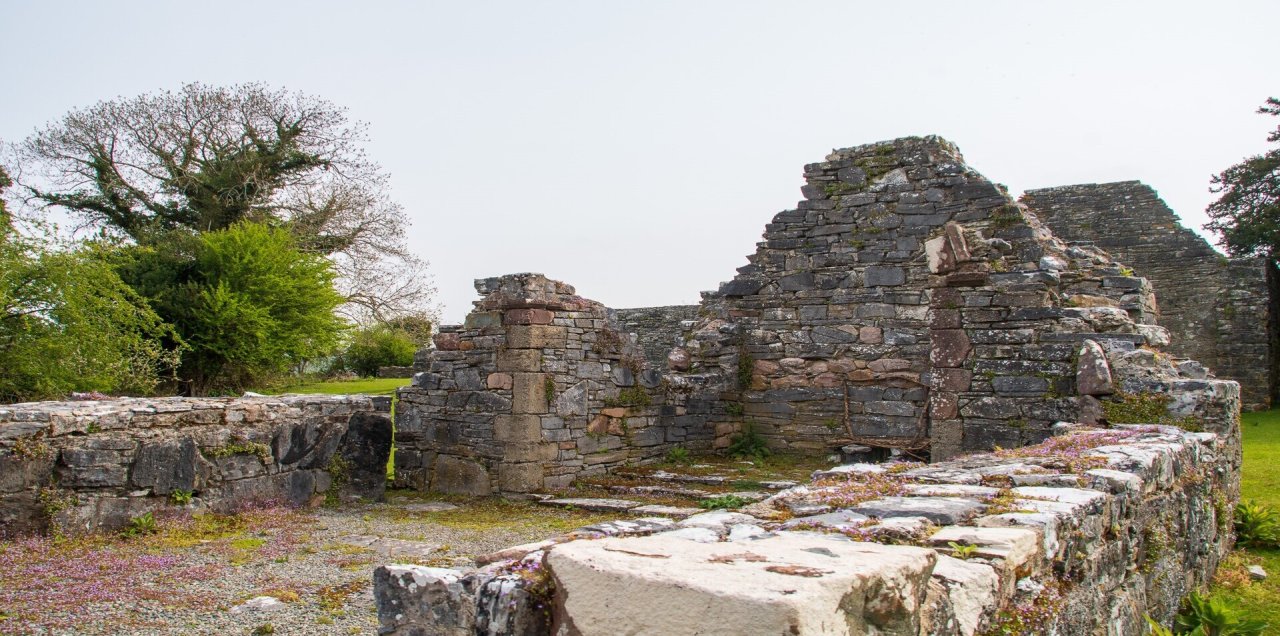 stone monastery buildings and round tower